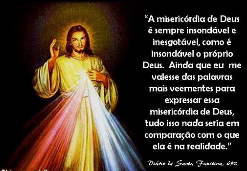 “A tua tarefa e obrigação é pedir aqui na Terra a misericórdia para o mundo inteiro. Nenhuma alma terá justificação, enquanto não se dirigir, com confiança, à Minha misericórdia. E é por isso que o primeiro domingo depois da Páscoa deve ser a Festa da Misericórdia. Nesse dia, os sacerdotes devem falar às almas desta Minha grande e insondável misericórdia. Faço-te dispensadora da Minha misericórdia. Diz ao teu confessor que aquela Imagem deve ser exposta na igreja, e não dentro da clausura desse Convento. Por meio dessa Imagem concederei muitas graças às almas; que toda alma tenha, por isso, acesso a ela” (D. 570);