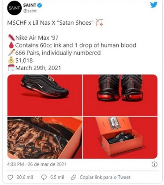 O cantor de “Old Town Road” deve lançar o par de sapatos em 29 de março, em colaboração com a Nike. Os sapatos custam a partir de US $ 1.018 e contêm “tinta 60 cc e 1 gota de sangue humano”.