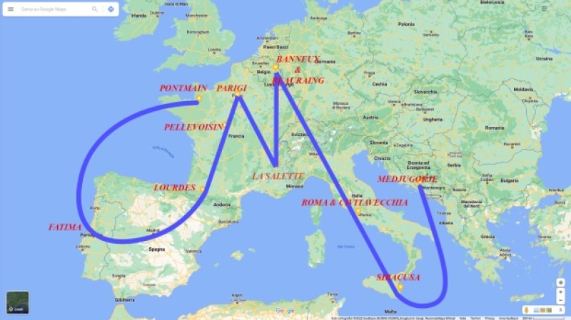 É chamada de "Assinatura de Maria" e se estende de Fátima a Medjugorje. Há uma linha em forma de “M”, a chamada “assinatura de Maria”, que reúne os principais locais das aparições e milagres realizados por Nossa Senhora na Europa.