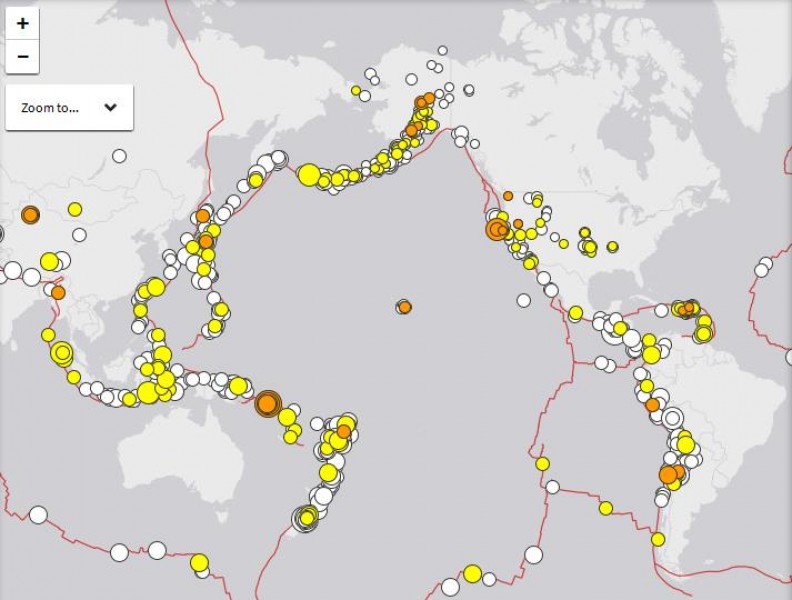 E, naturalmente, a falha de San Andreas é apenas uma pequena parte de uma zona sísmica conhecida como o Anel de Fogo que circunda aproximadamente todo o Oceano Pacífico. O US Geological Survey fornece ferramentas que mostram os últimos terremotos do mundo e, mais cedo hoje, usei uma dessas ferramentas para exibir todos os terremotos ao longo do Anel de Fogo de magnitude 2,5 ou superior que ocorreram nos últimos 30 dias. O seguinte é uma captura de tela do que eu descobri.