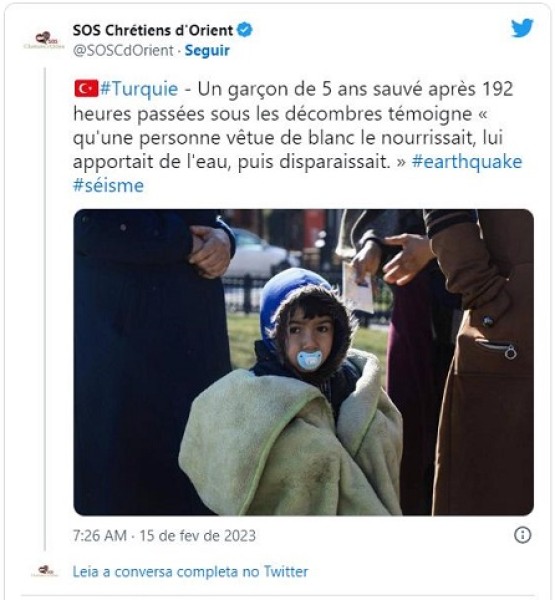 Uma história movimentou as redes sociais nas últimas horas. Uma criança que ficou enterrada por quase quatro dias nos escombros após o terremoto na Turquia disse que foi alimentada por uma pessoa vestida de branco, que depois desapareceu.