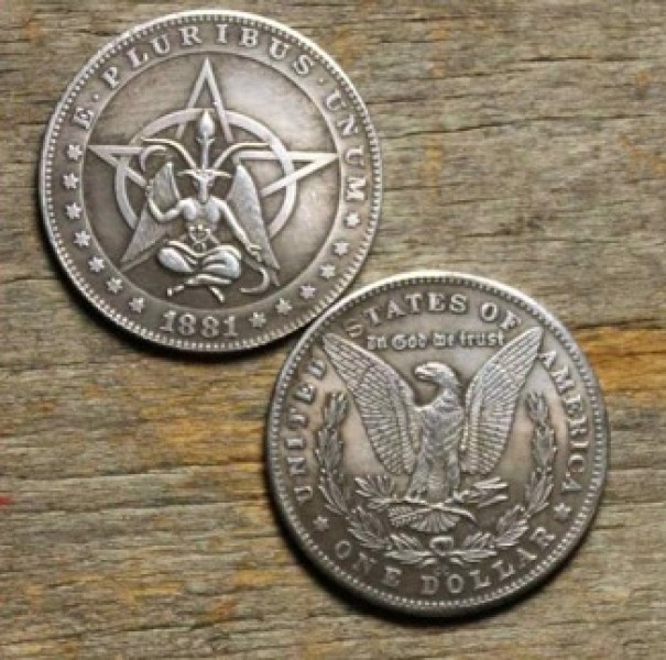 Edição limitada de moeda de um dólar americano com a imagem de Baphomet.