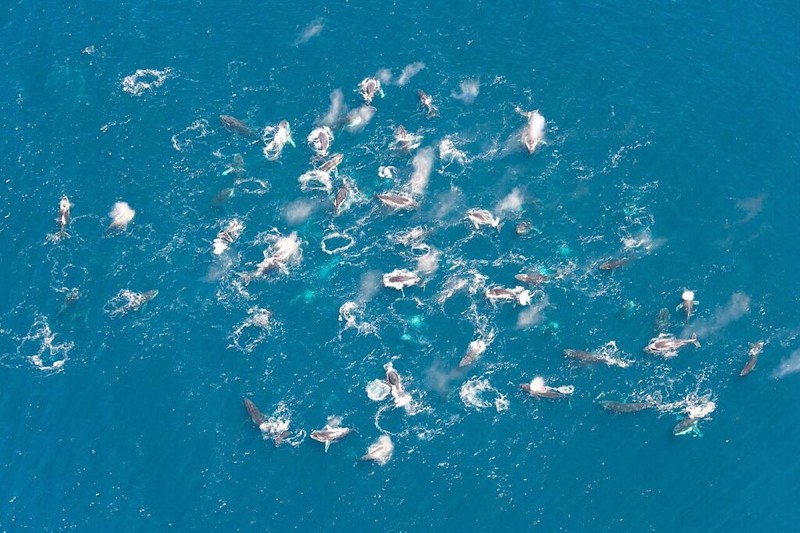 Congregações de baleias geralmente indicam que certas partes do oceano são especialmente ricas em alimento. Tem de haver uma densa concentração de presas para suportar tantas baleias-jubarte nesta área.