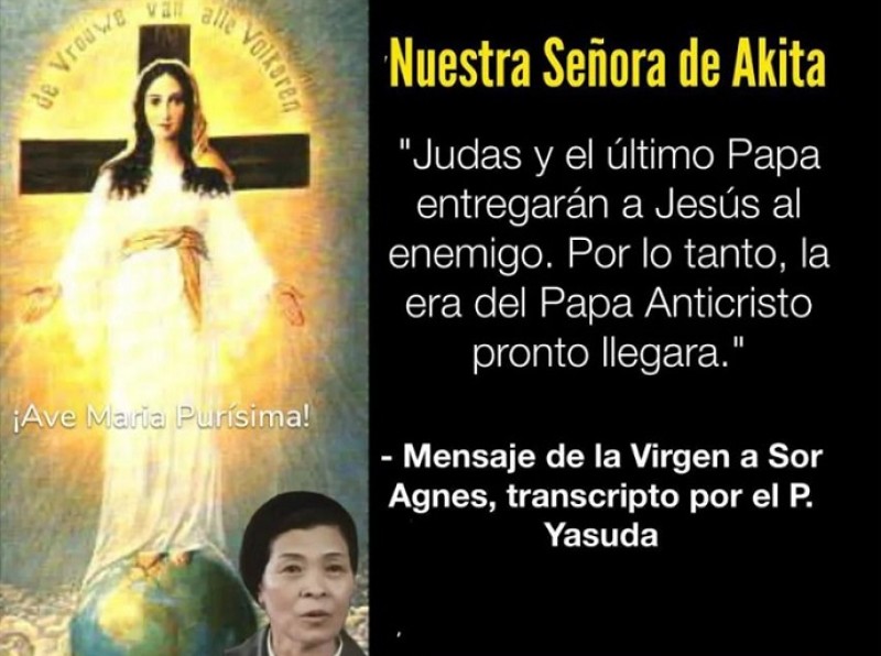 Recentemente se descobriu uma mensagem da Virgem Maria no livro escrito pelo diretor espiritual de Sor Agnes, vidente de Akita: Judas e o Papa Anticristo.