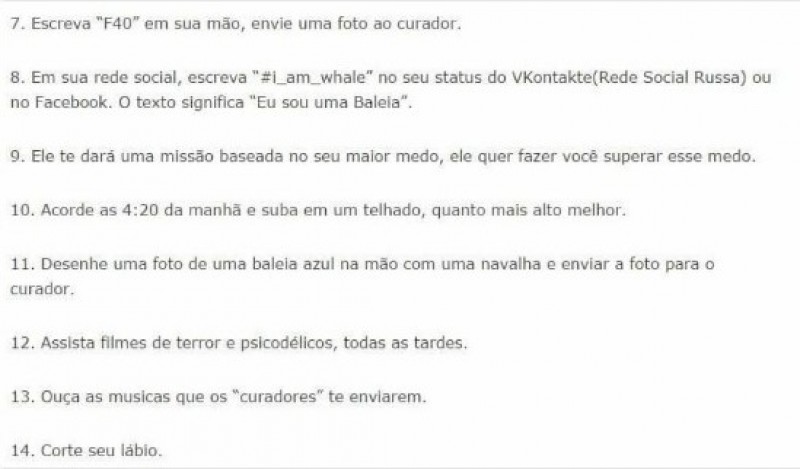 Afinal, quais são os 50 desafios do jogo Baleia Azul? (Extraído da rede social)