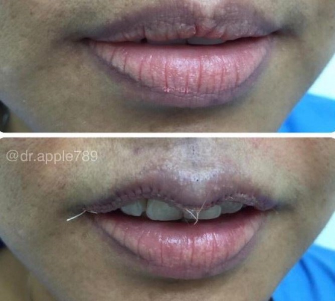 A cirurgiã plástica Melissa Doft, especializada em procedimentos de cirurgia plástica para reduzir lábios, explica que a principal coisa é fazer uma remoção especial da pele dos lábios e, em seguida, usar os pontos para formar uma nova linha nos lábios. Este procedimento é feito em ambulatório, e a anestesia local age por cerca de 15 a 30 minutos, dependendo do tecido removido. Os pontos devem ser deixados por uma semana, para dissolverem sozinhos ou serem removidos manualmente.