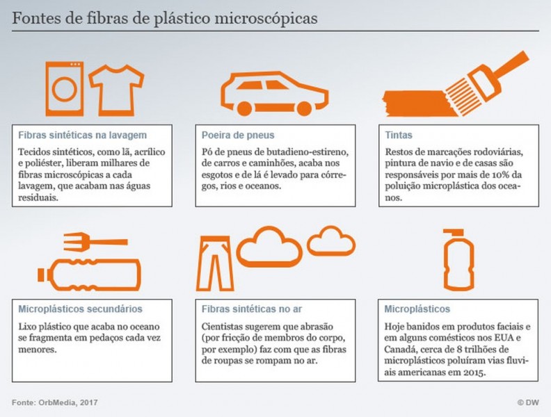 Existe uma fonte confirmada de poluição de fibras plásticas – e você provavelmente a está usando. As roupas de tecidos sintéticos emitem até 700 mil fibras por lavagem, apontam os pesquisadores. A maior parte escapa do processo de tratamento de água e é descarregada em cursos d'água. Mason afirma que águas residuais tratadas com fibras são provavelmente coletadas e, posteriormente, encaminhadas para casas de outras comunidades.