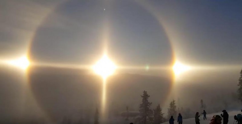 Isso é um céu com três Sóis? Na verdade, é apenas uma ilusão celeste rara chamada Parhelion, um fenômeno óptico que ocorre com a refração da luz nas partículas de gelo das nuvens. Uma vez que a água pode congelar na atmosfera em cristais de gelo pequenos, planos e de seis lados, fenômenos como este podem aparecer inesperadamente.