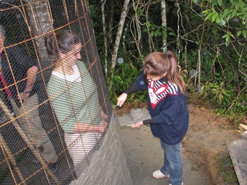 – sobre esta “jaula” começa-se a colocar a massa trabalhando em duplas: uma pessoa fica dentro, com uma peça de fórmica para amparar a massa que está sendo colocada, e outra por fora, colocando a massa. Este trabalho deve ser feito em um único dia, para montar uma única estrutura de cimento, sem emendas. Se houverem furinho, não tem problema, eles serão cobertos no dia seguinte.