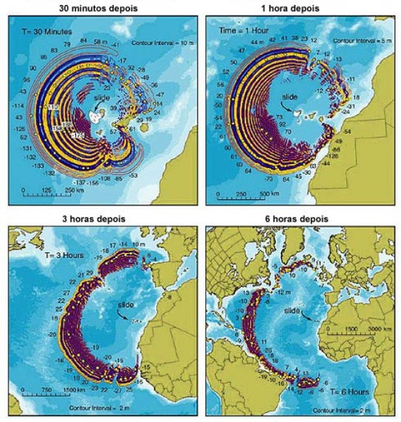 Um modelo de propagação apresentado certa vez pela rede de TV BBC, da Inglaterra, mostrou que o colapso da montanha geraria ondas com 40 metros de altura, que chegariam ao Brasil em 8 ou 9 horas.