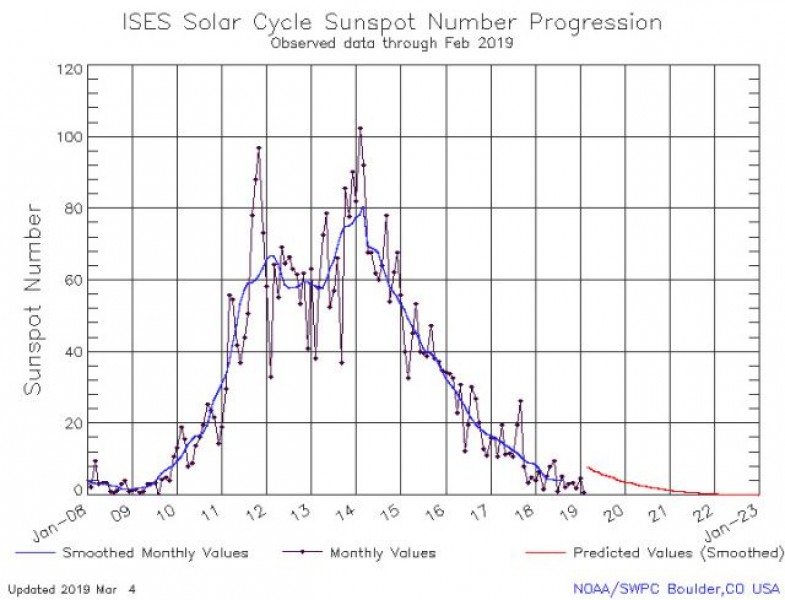 Em fevereiro de 2019, o número total de manchas observáveis que cruzaram a superfície solar foi zero e esse número é muito abaixo da média mensal de longo prazo. O Sol está estranhamente passivo há algum tempo e nem de longe lembra aquela máquina de explosões observada há 11 anos.