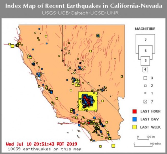 Estive de olho no mapa recente de terremoto da Cal Tech e, enquanto escrevo este artigo, há 10.953 tremores na Califórnia e em Nevada nos últimos sete dias. Eu nunca tinha visto este número tão alto, e o sul da Califórnia está sendo atingido por mais um novo terremoto a cada instante. A maioria dos terremotos está acontecendo na área de Ridgecrest, onde testemunhamos o terremoto de magnitude 6,4 que ocorreu no dia 4 de julho e o terremoto de magnitude 7,1 que ocorreu no dia 5 de julho.