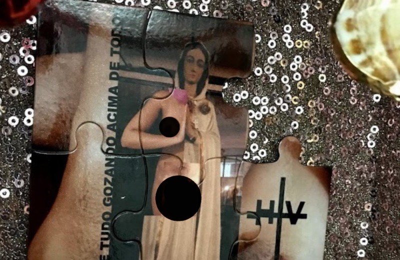 A imagem exposta no Centro Cultural Hélio Oiticica, no rio de Janeiro, conta ainda com a inscrição “Deus acima de tudo, gozando acima de todos”.