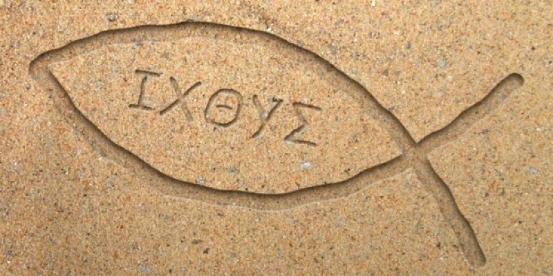 Um desses códigos era o “Ichthys” ou “Ichthus”, palavra que, em grego antigo (á¼°χθÏς), significava “peixe“. As letras que formam a palavra “peixe” em grego, quando escritas em maiúsculas (ΙΧΘΥΣ), formam um acrônimo com as iniciais da expressão “IÄsous Christos Theou Yios SÅtÄr“, que significa “Jesus Cristo, Filho de Deus, Salvador” (em grego antigo: Ἰησοῦς ΧριστÏς, Θεοῦ ÍΥιÏς, Σωτήρ).