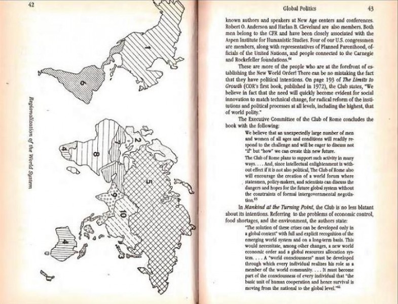 O Clube de Roma foi encarregado da tarefa de supervisionar a regionalização e unificação de todo o mundo; o Club poderia, portanto, dizer-se que está um passo acima dos Bilderbergers na hierarquia de um mundo. (O fundador do COR, Peccei, tem sido um associado próximo dos Bilderbergers. Tanto quanto pude determinar, a maior parte das diretivas para o planejamento do governo mundial são atualmente provenientes do Clube de Roma.