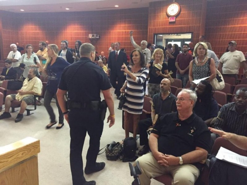 Quando foi anunciado que o líder do grupo havia recebido permissão para se manifestar, uma multidão de cristãos (católicos e evangélicos) decidiram agir. Dois pastores da igreja metodista lideraram centenas de pessoas de diferentes denominações que foram até o local. Uma parte ficou na frente do prédio, em oração contra a manifestação satânica. Um grupo menor entrou na sala do Conselho e começou a orar um Pai Nosso em voz alta assim que Suhor começou a clamar pela intervenção do Diabo na cidade. Alguns dos presentes se exaltaram e queriam impedir que a invocação continuasse. A polícia foi chamada. Bare deixou claro que deveria ser feito silêncio no recinto. Avisou que os descontentes deveriam sair ou os policiais iriam prendê-los por causar perturbação em espaço público. Também alertou o líder do Templo Satânico que ele não poderia fazer discursos, apenas sua oração. Cerca de um terço dos cristãos preferiu sair junto com o conselheiro Gerald Wingate.
