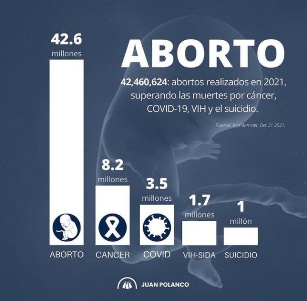 Em 2021 o aborto foi a primeira causa de morte a nível mundial, com 42,6 milhões de seres humanos, segundo números do Worldometer, baseados em dados sobre aborto publicados pela Organização Mundial de Saúde, uma das maiores organizações mundiais que promove o aborto como parte da sua agenda.