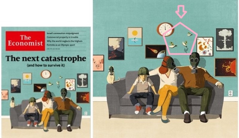 Capa da revista britânica The Economist, anunciando as próximas catástrofes. Na imagem, temos 3 pássaros em voo, sendo que um deles vem abaixo.