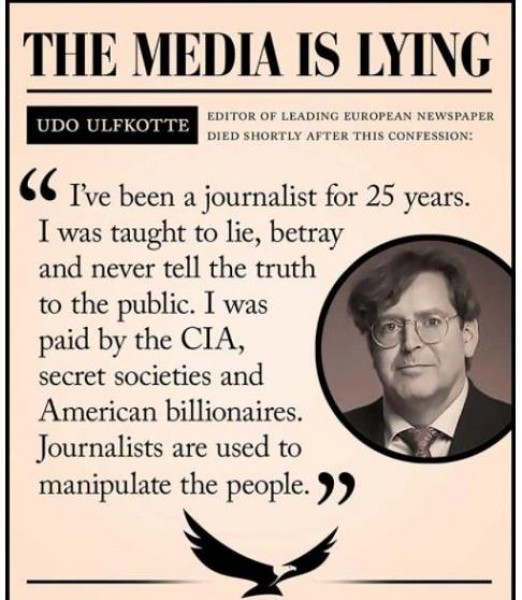 Algo incrível foi revelado por um herói corajoso da humanidade. Udo Ulfkotte foi o editor de um dos maiores jornais da Europa, o Frankfurter Algemeine Zeitung. Há alguns anos ele confessou ao mundo que jornalistas do mundo inteiro são pagos pela CIA, sociedades secretas, governos, bilionários, etc. para... sempre mentir, e nunca dizer a verdade ao público.