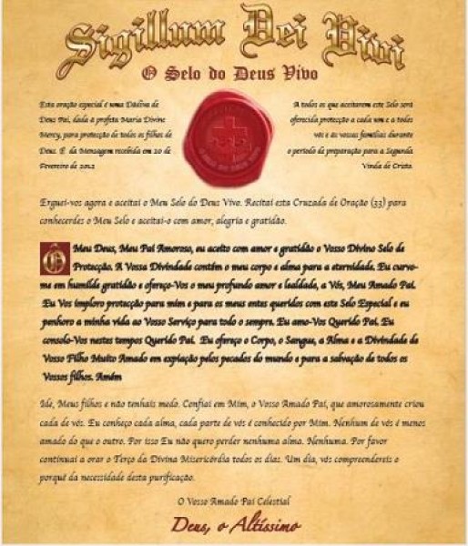 O Selo é um dos maiores Dons: “Aceitai o Meu Selo como um dos maiores Dons que Eu dei à humanidade desde que os dei Vida. Eu dou a Vida novamente com as Minhas Graças Especiais quando manterdes perto de vós, o Selo do Deus Vivo. À todos aqueles com o Selo são concedidos um lugar no Novo Paraíso” (Deus Pai, 23/8/2013).