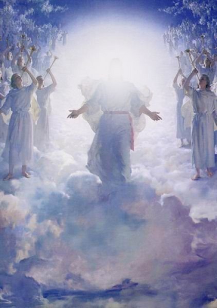 Após alguns momentos, quando o esplendor diminuiu um pouco, toda a assembléia, no maior silêncio e nas mais intensas emoções da alma, olhou para a luz do alto, que ainda ficou por algum tempo. Nessa luz vi descer duas figuras, no começo pequenas, crescendo cada vez mais e aparecer, com vestes longas e brancas e um bastão na mão, como profetas, falando à multidão; as vozes soavam alto e forte, como a de trombetas e parecia-me que as deviam ouvir em Jerusalém. Não se moviam, mas estavam inteiramente imóveis, ao dizer as poucas palavras: “Homens da Galiléia, que estais aí olhando para o céu? Esse Jesus que acaba de vos ser arrebatado, para subir ao céu, voltará como o vistes subir ao céu.” Tendo dito essas palavras, desapareceram.