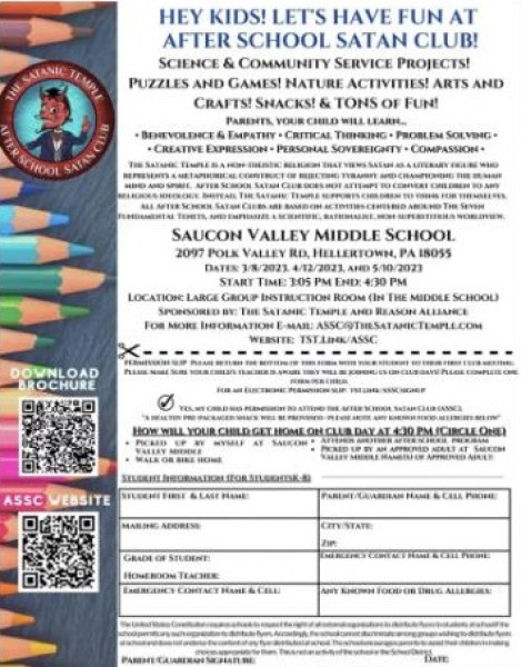 O juiz distrital John M. Gallagher autorizou a presença do grupo satanista “Satã Depois da Escola” na escola Saucon Valley, na Pensilvânia. A decisão veio depois de grupos de direitos humanos processarem a instituição, que cancelara os eventos após pressão de pais indignados com a iniciativa.
